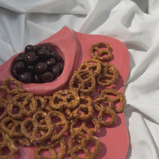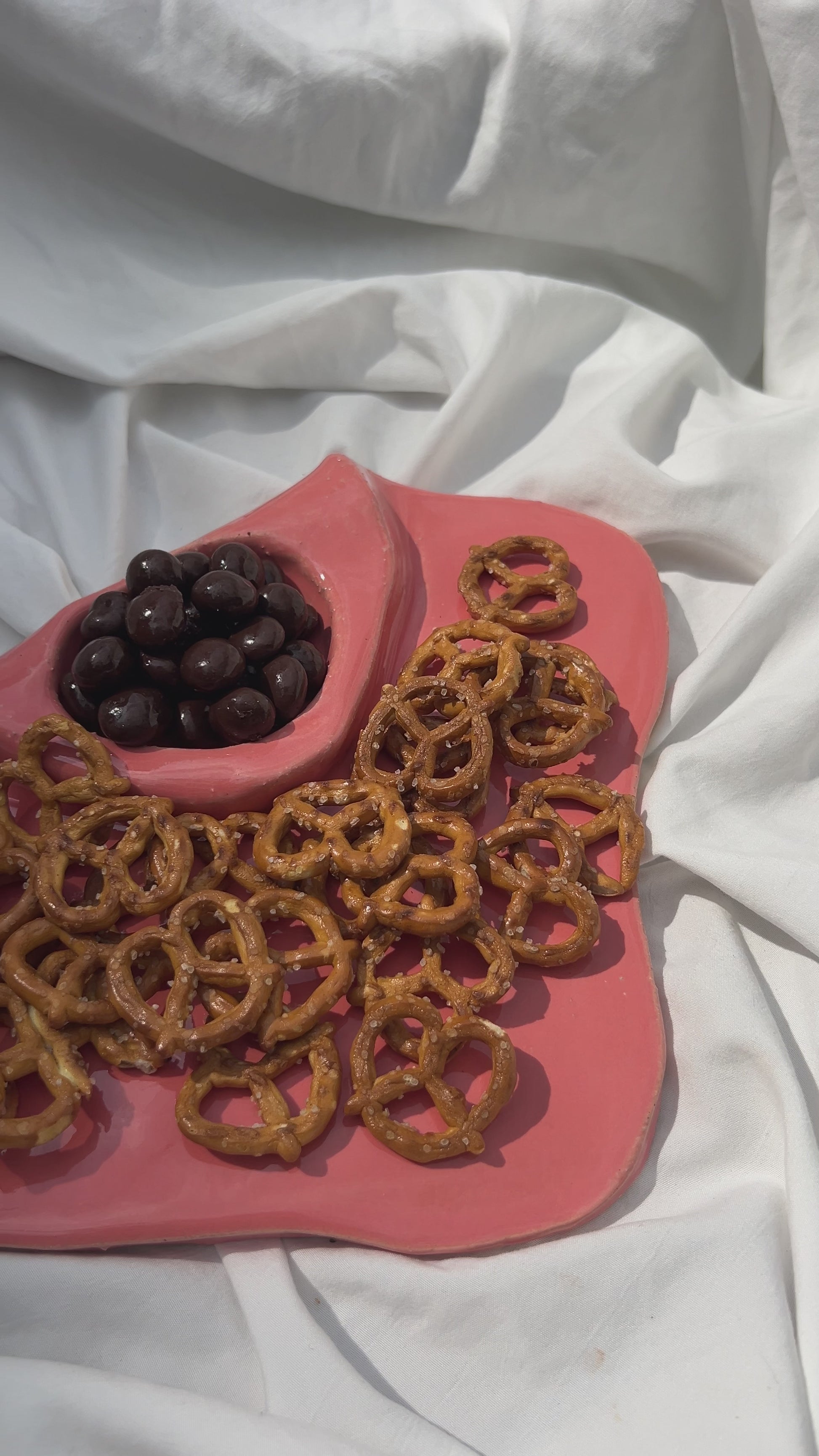 This elegant pink coral ceramic plate is hand-sculpted into a distinctive folded form with a small dip bowl.